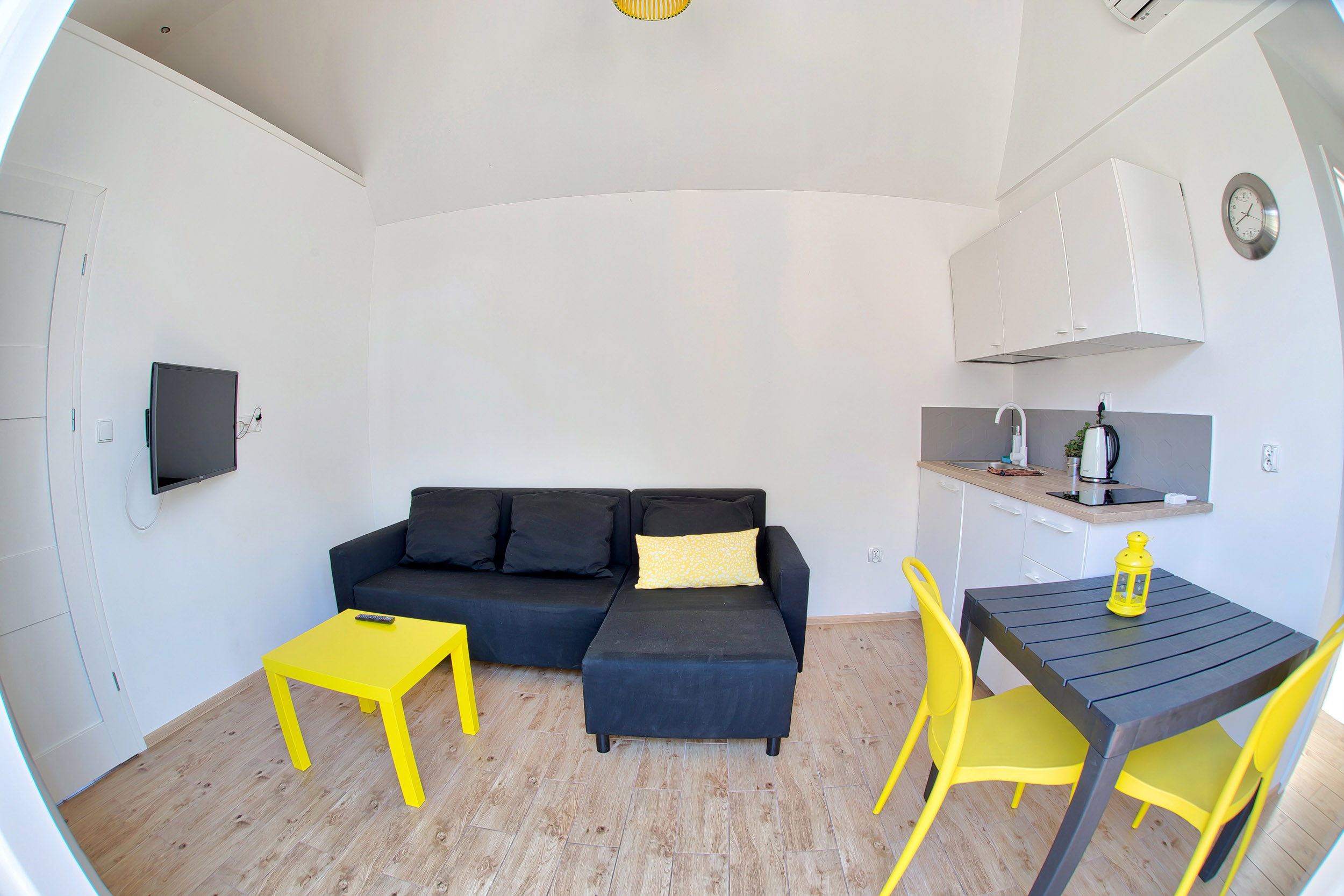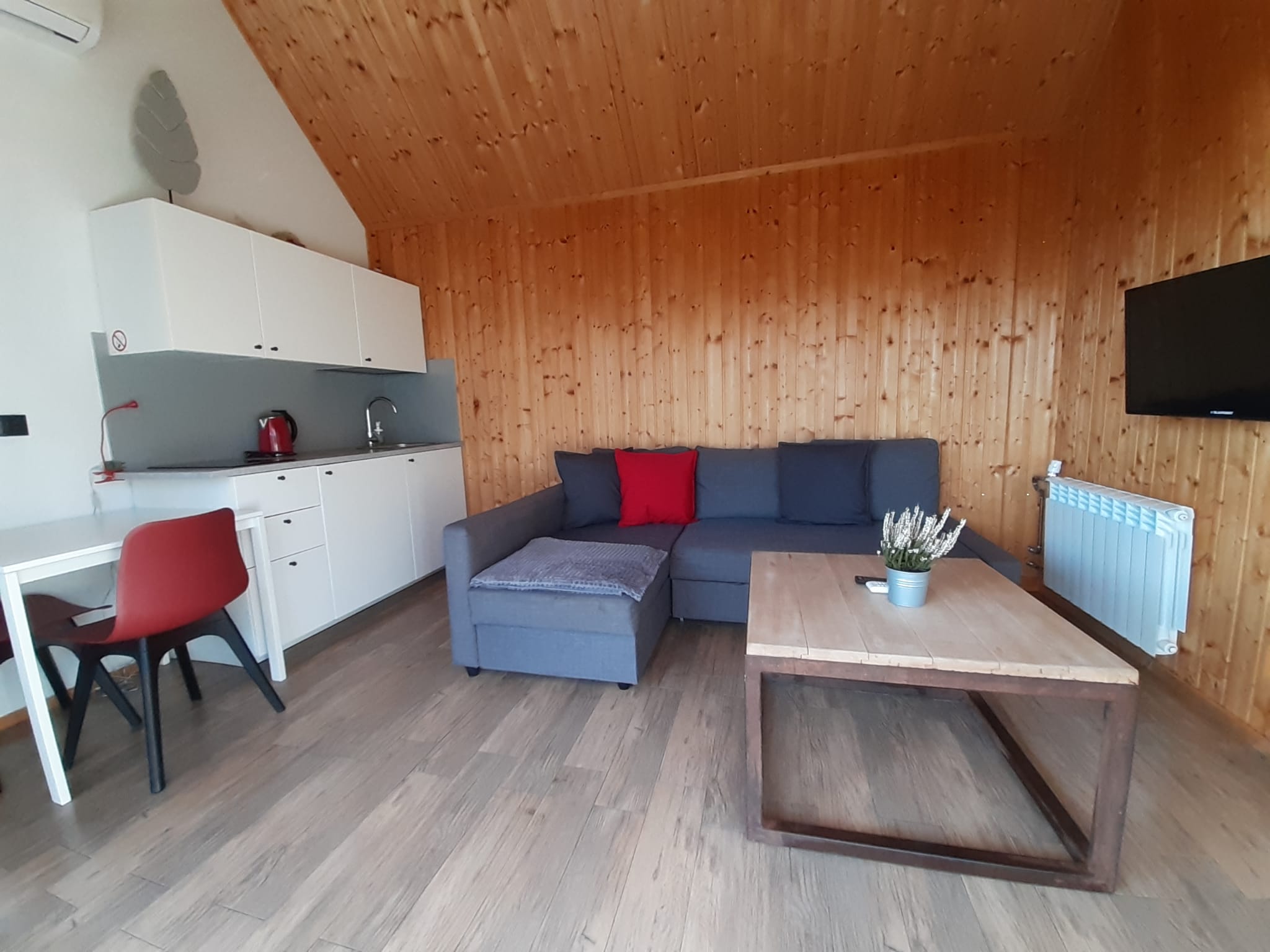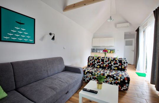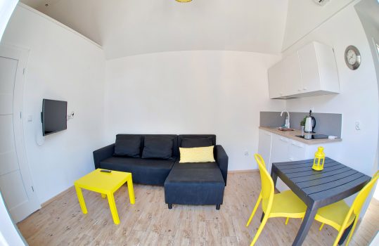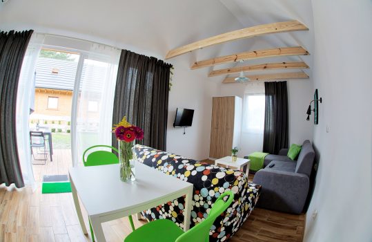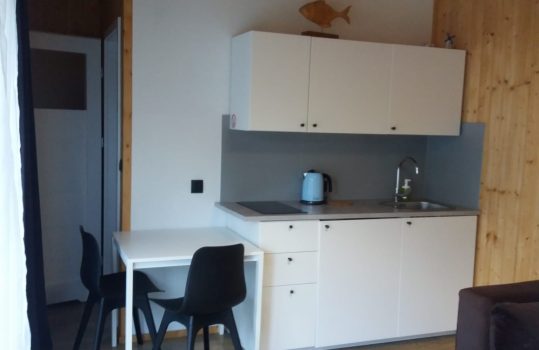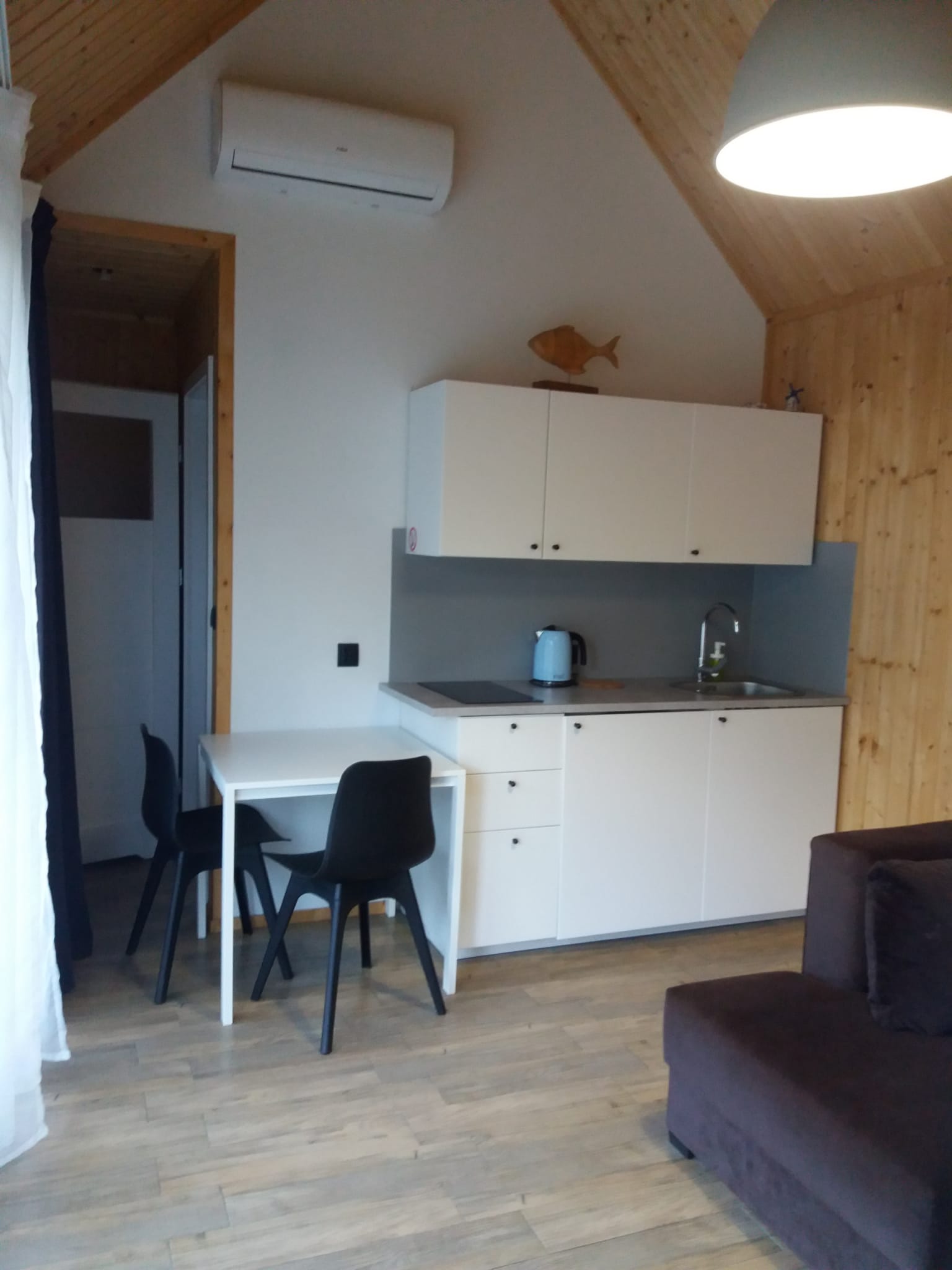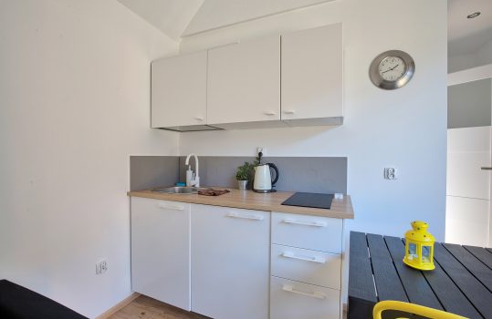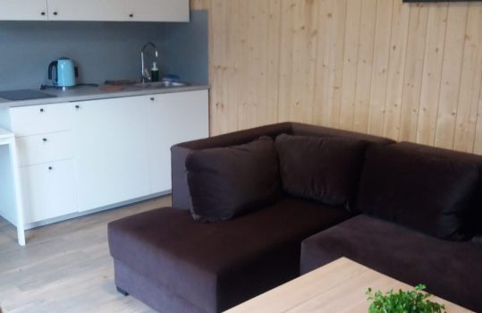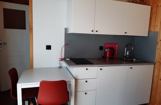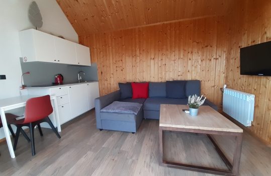 • Aneks kuchenny – W każdym domku znajduje się kuchnia. Wyposażona jest w lodówkę,  zlew, płytę grzewczą, okap, czajnik, akcesoria kuchenne.