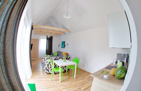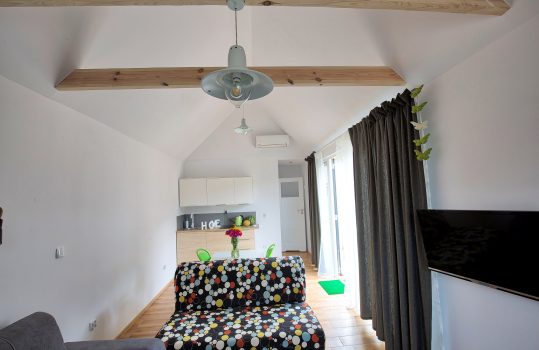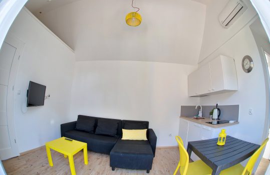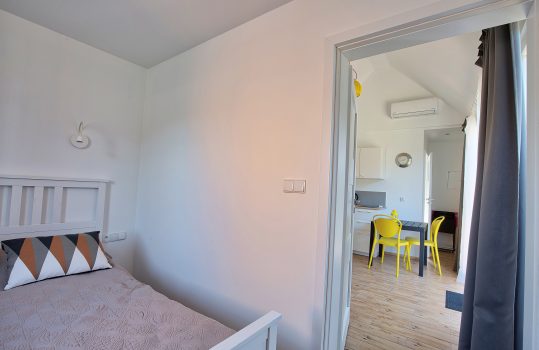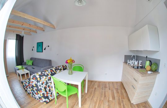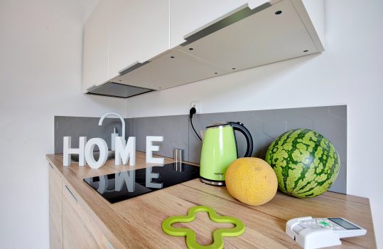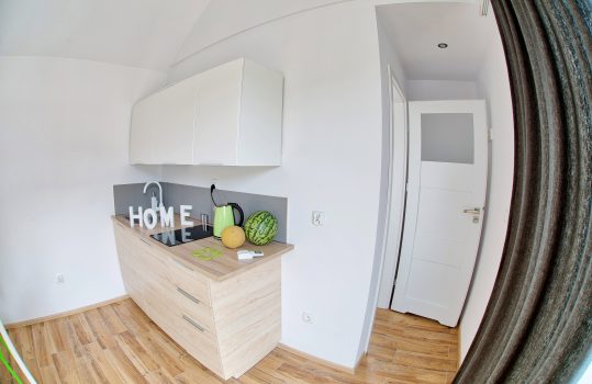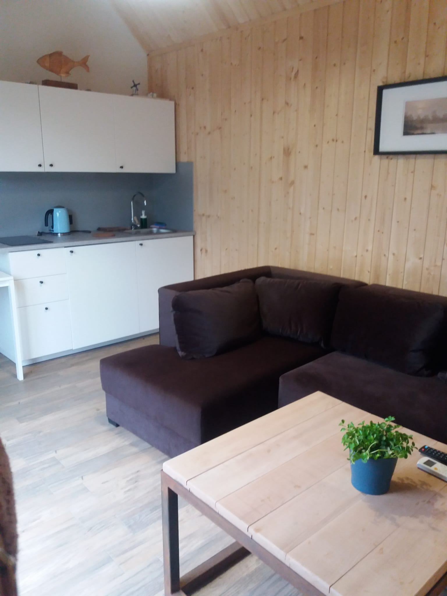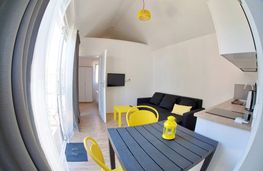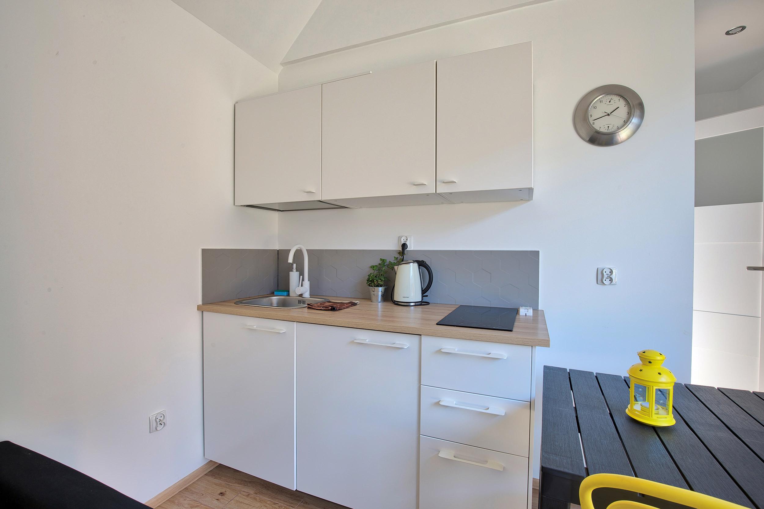 • Aneks kuchenny – W każdym domku znajduje się kuchnia. Wyposażona jest w lodówkę,  zlew, płytę grzewczą, okap, czajnik, akcesoria kuchenne.