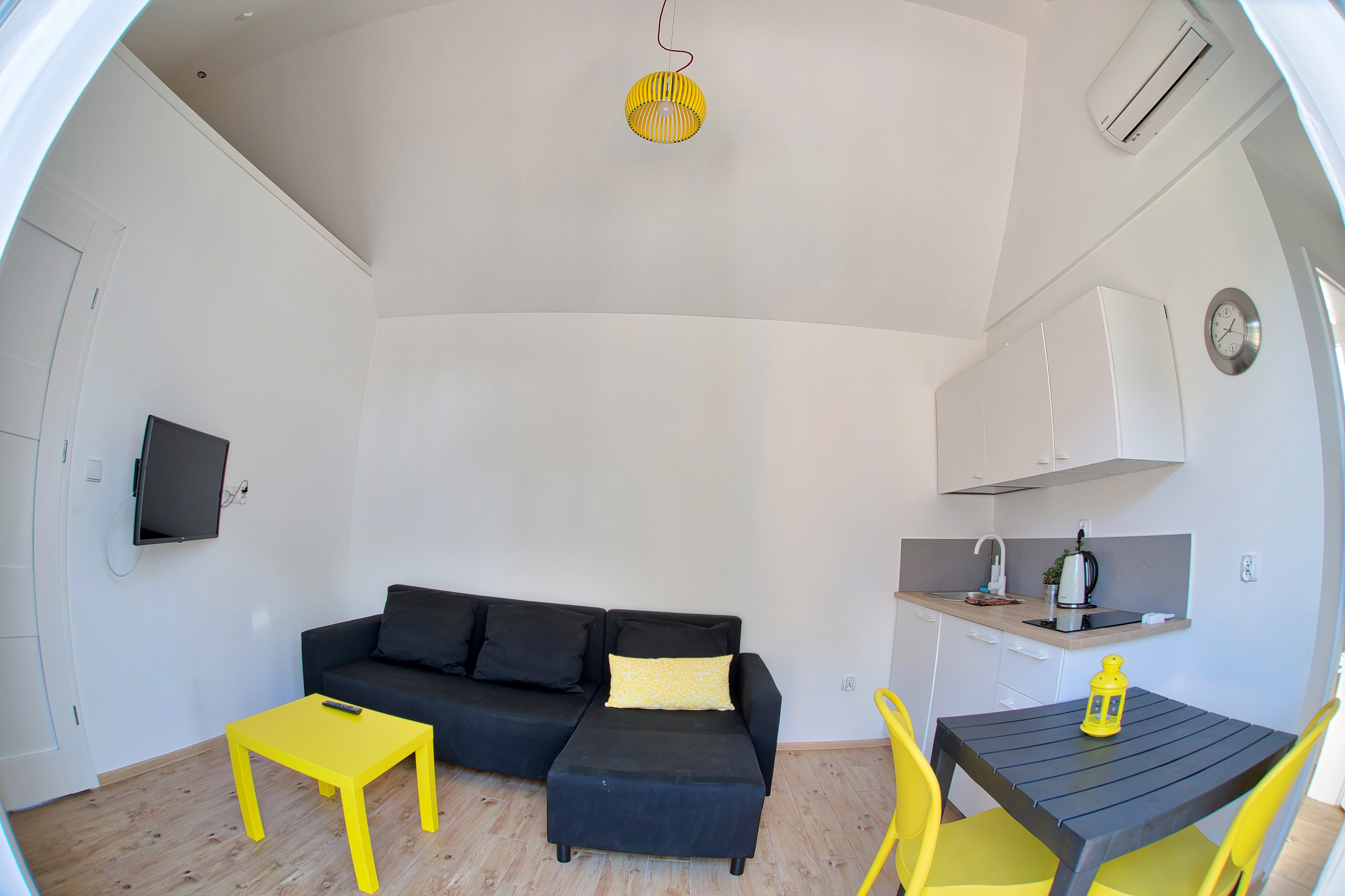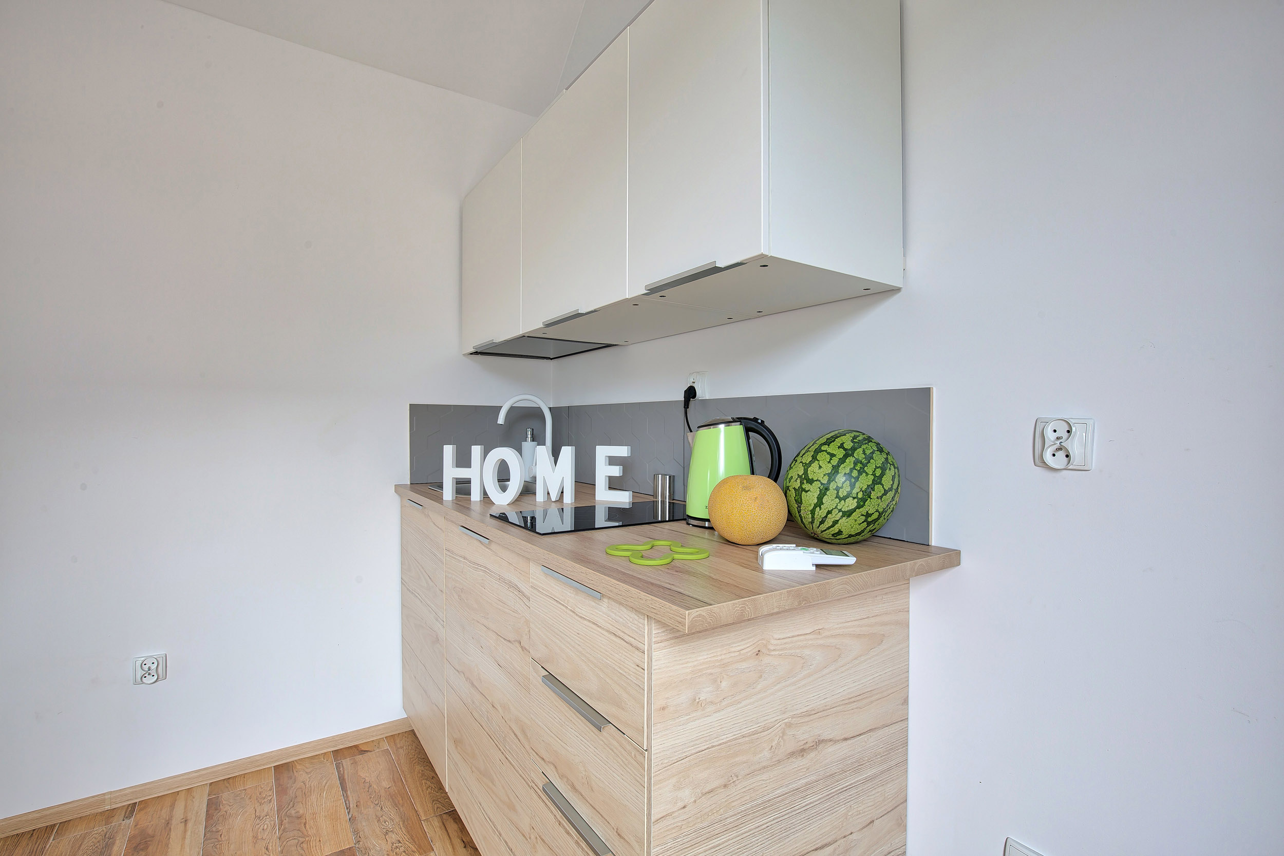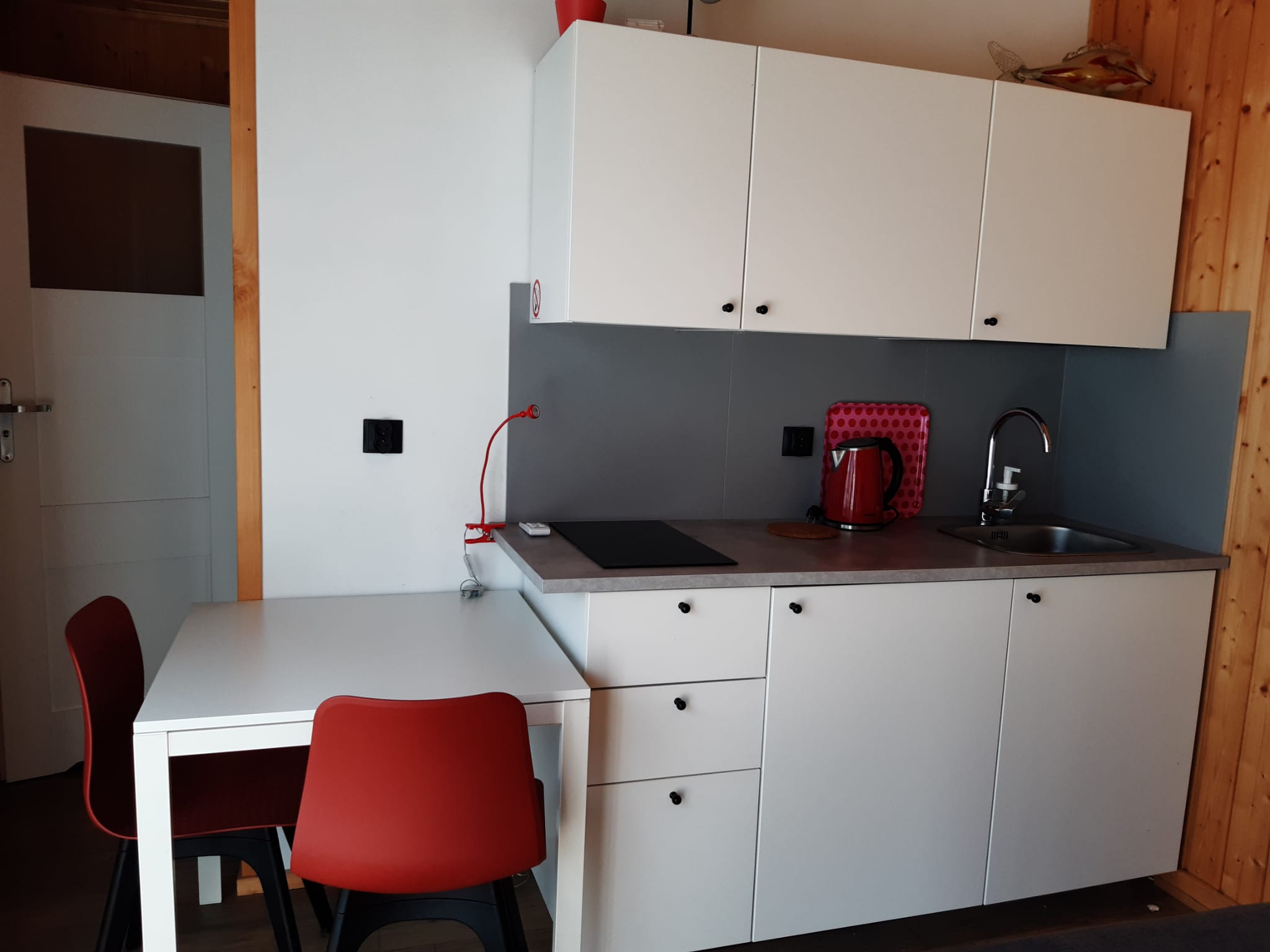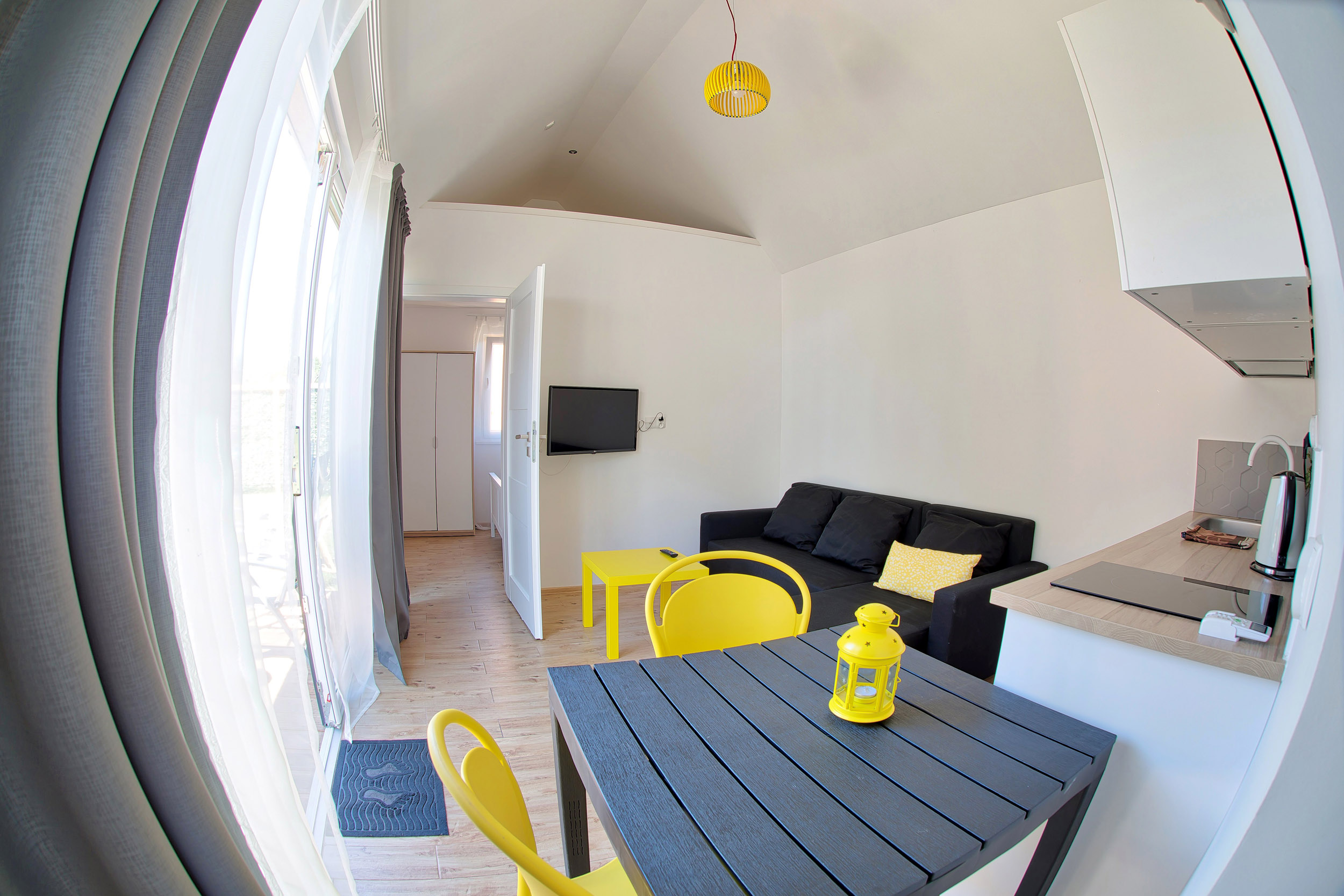 • Aneks kuchenny – W każdym domku znajduje się kuchnia. Wyposażona jest w lodówkę,  zlew, płytę grzewczą, okap, czajnik, akcesoria kuchenne.
