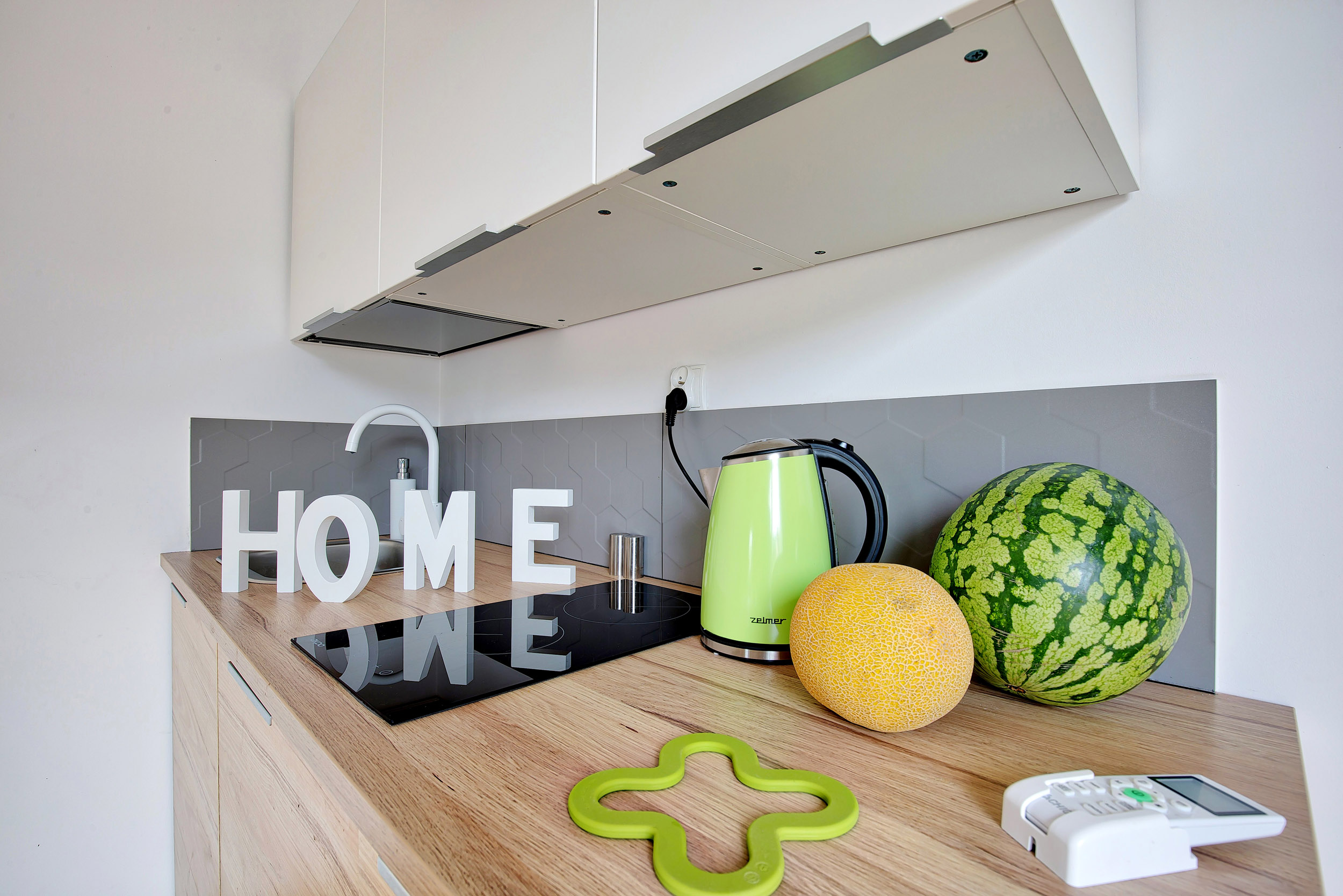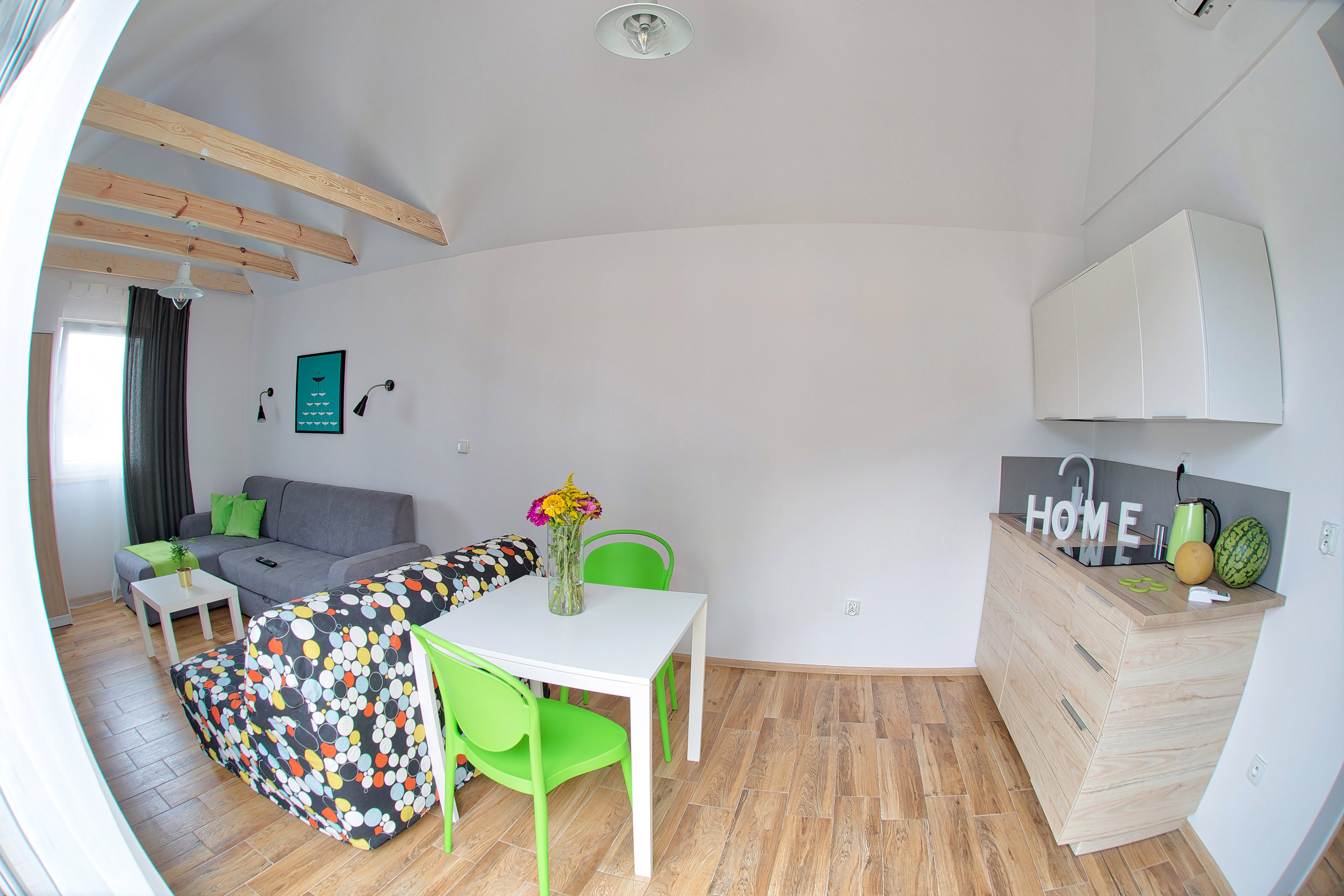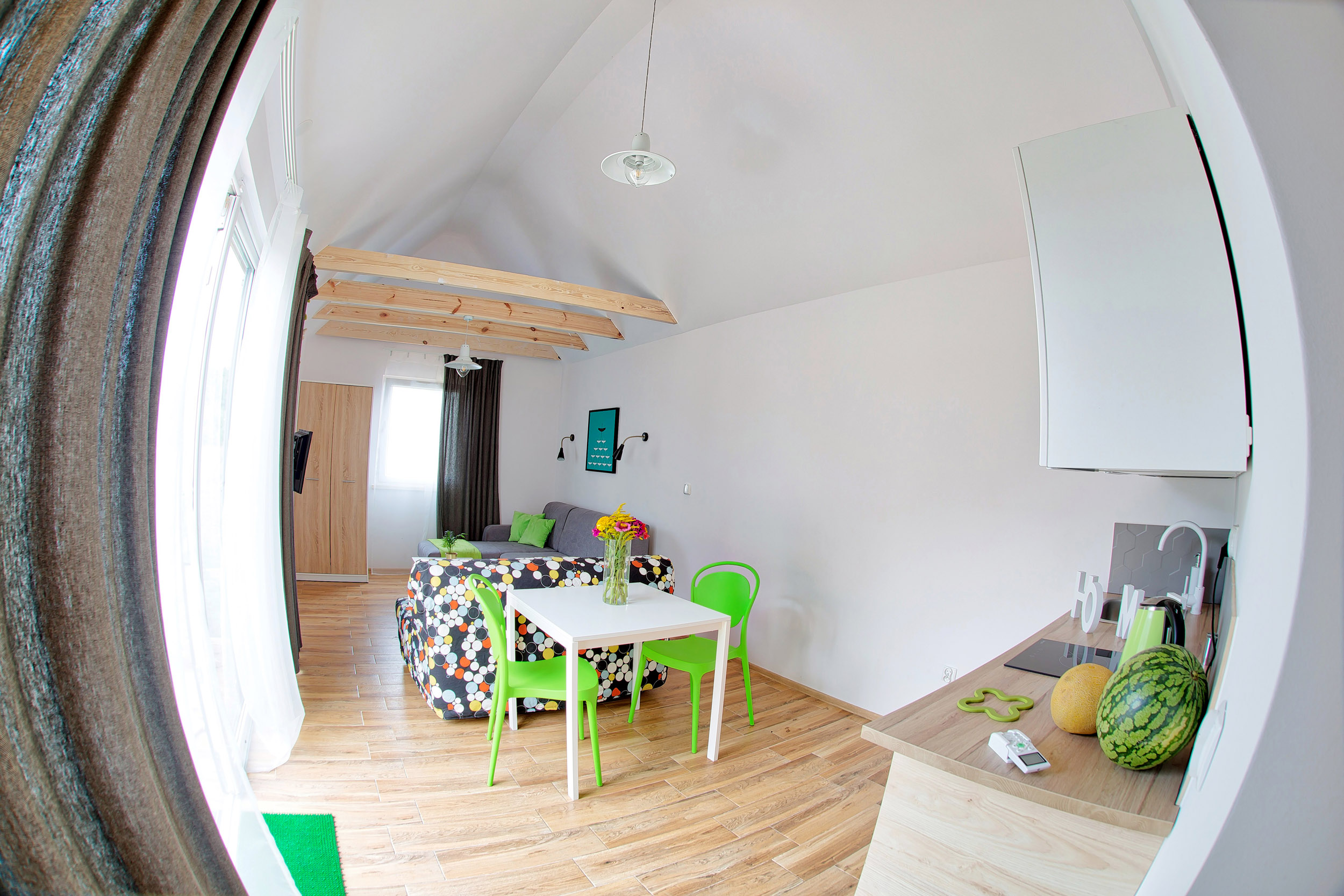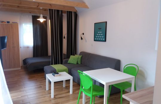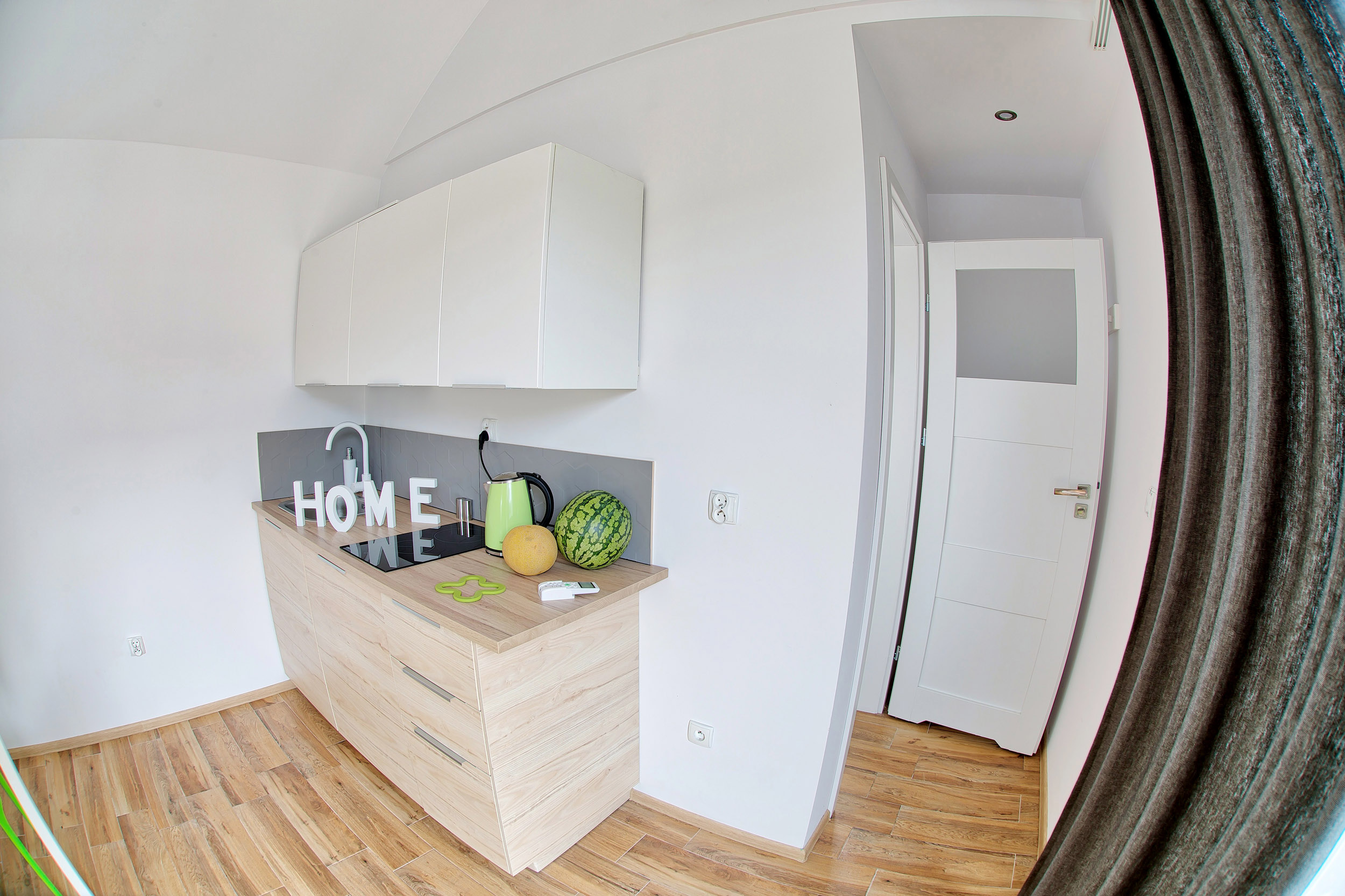 • Aneks kuchenny – W każdym domku znajduje się kuchnia. Wyposażona jest w lodówkę,  zlew, płytę grzewczą, okap, czajnik, akcesoria kuchenne.