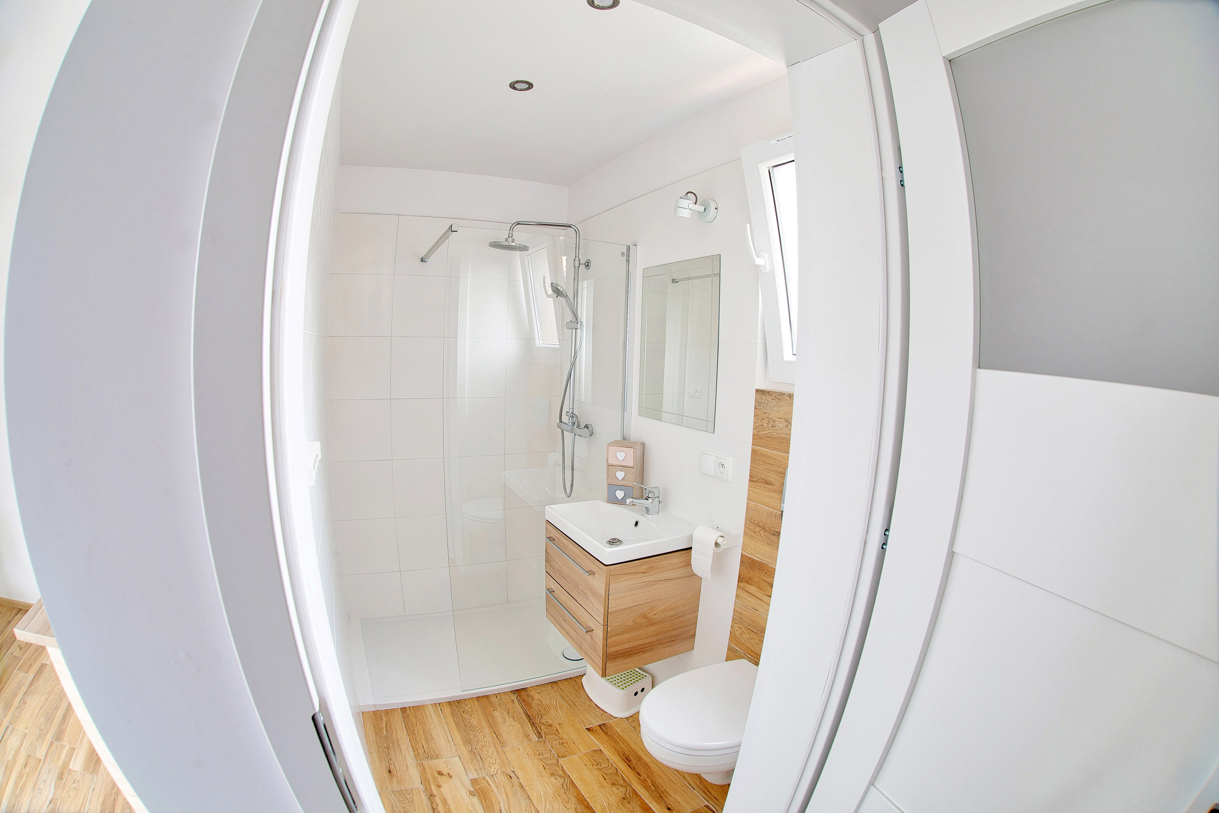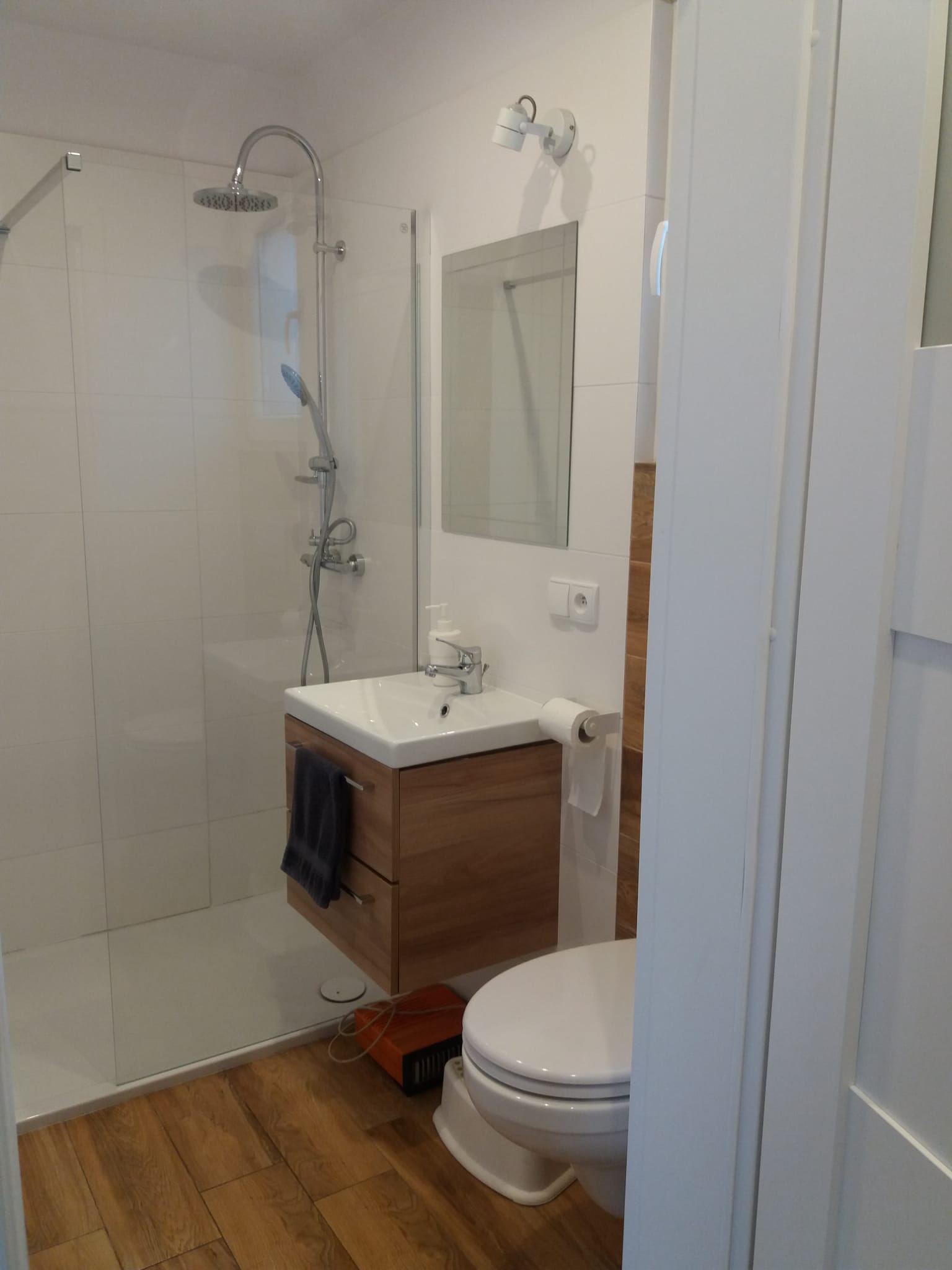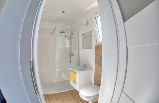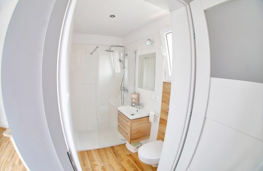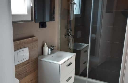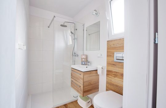 • Łazienka – Łazienka wyposażona w kabinę prysznicową, WC, umywalkę. Dodatkowo takie przybory jak mydło w płynie, papier toaletowy.