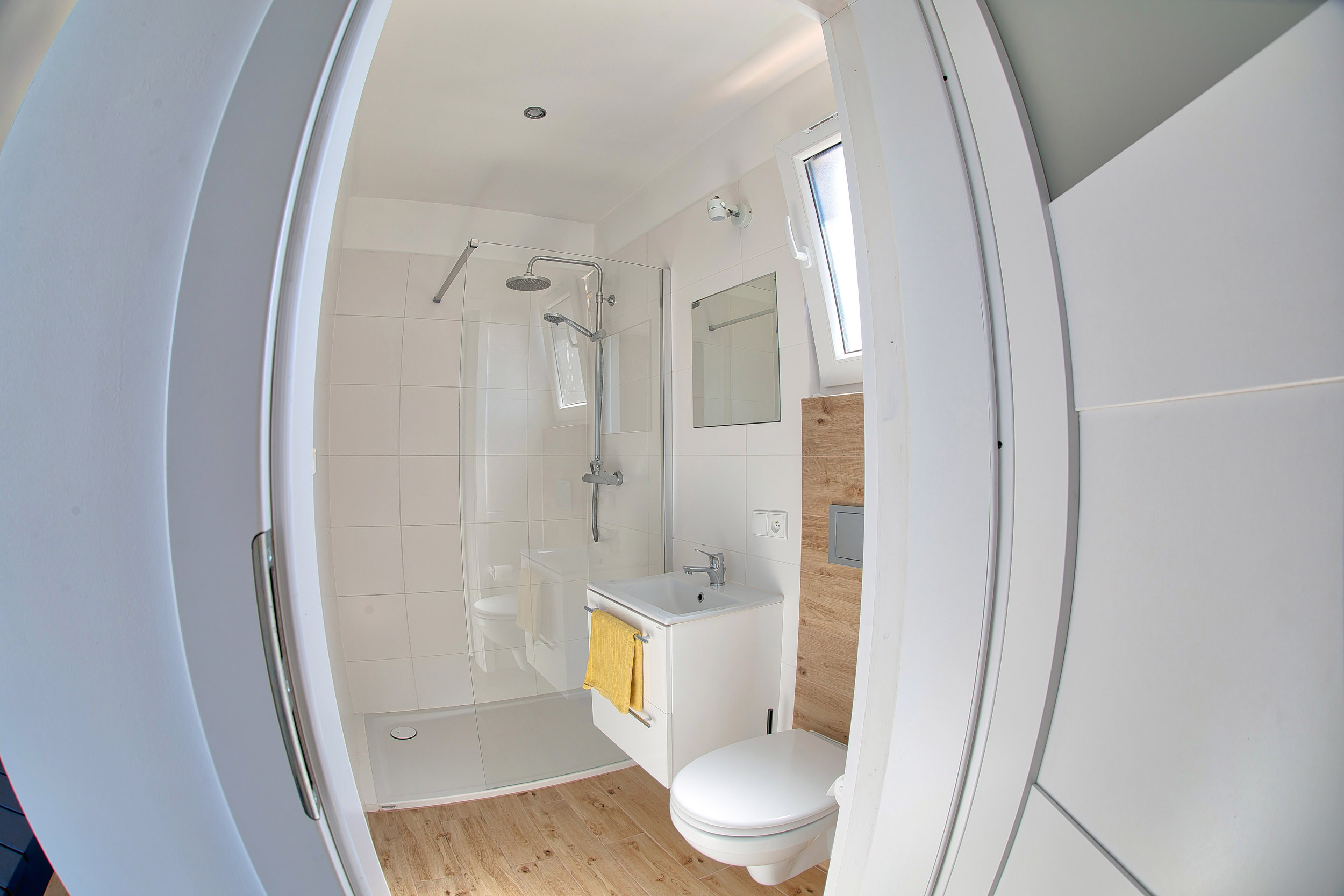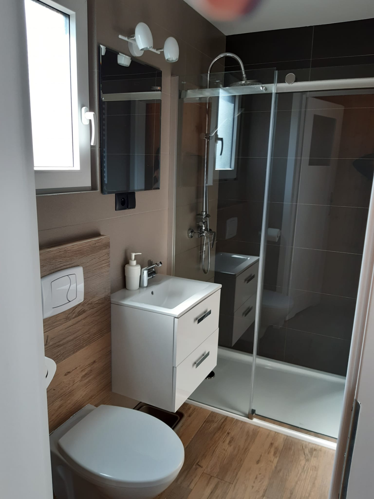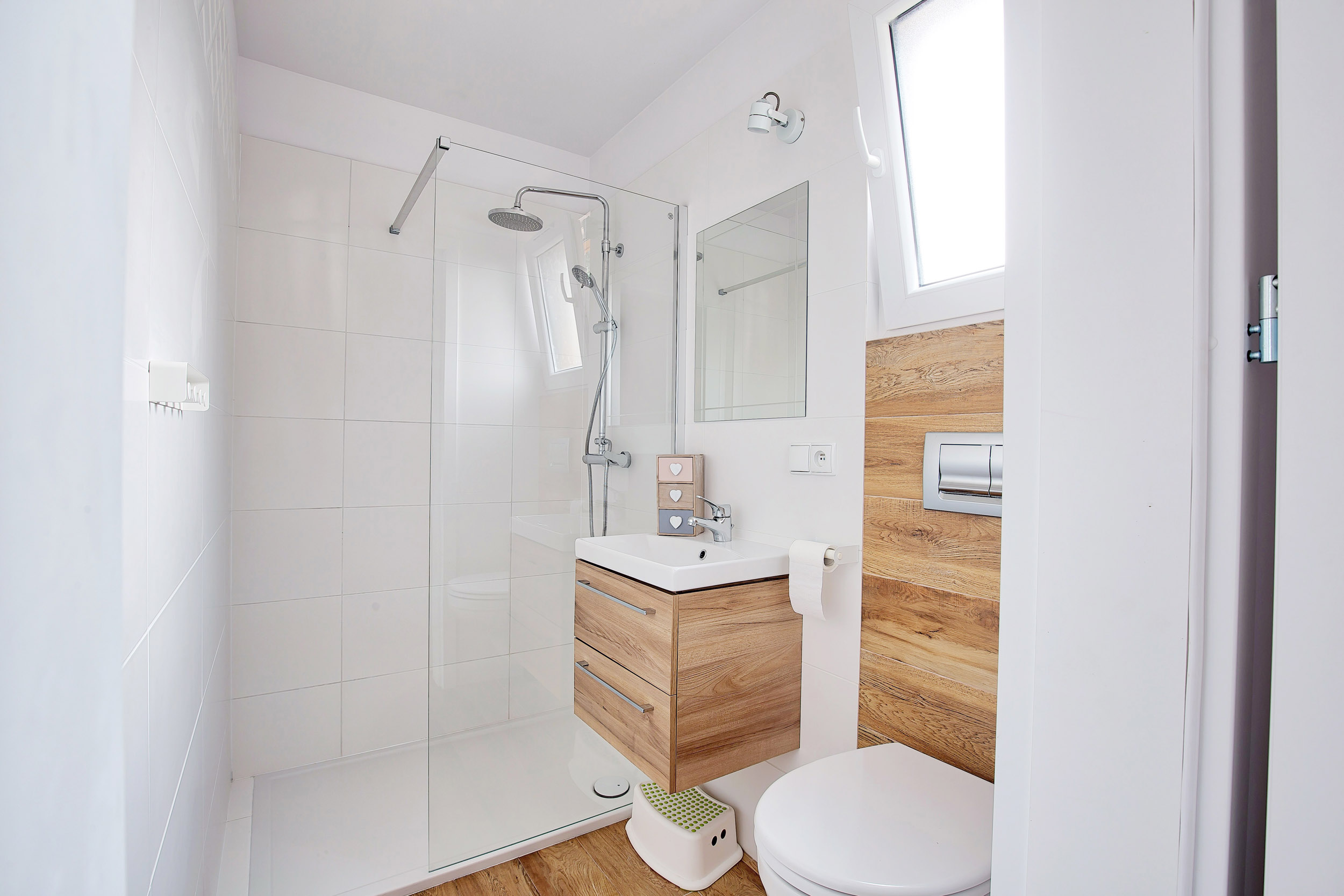 • Łazienka – Łazienka wyposażona w kabinę prysznicową, WC, umywalkę. Dodatkowo takie przybory jak mydło w płynie, papier toaletowy.